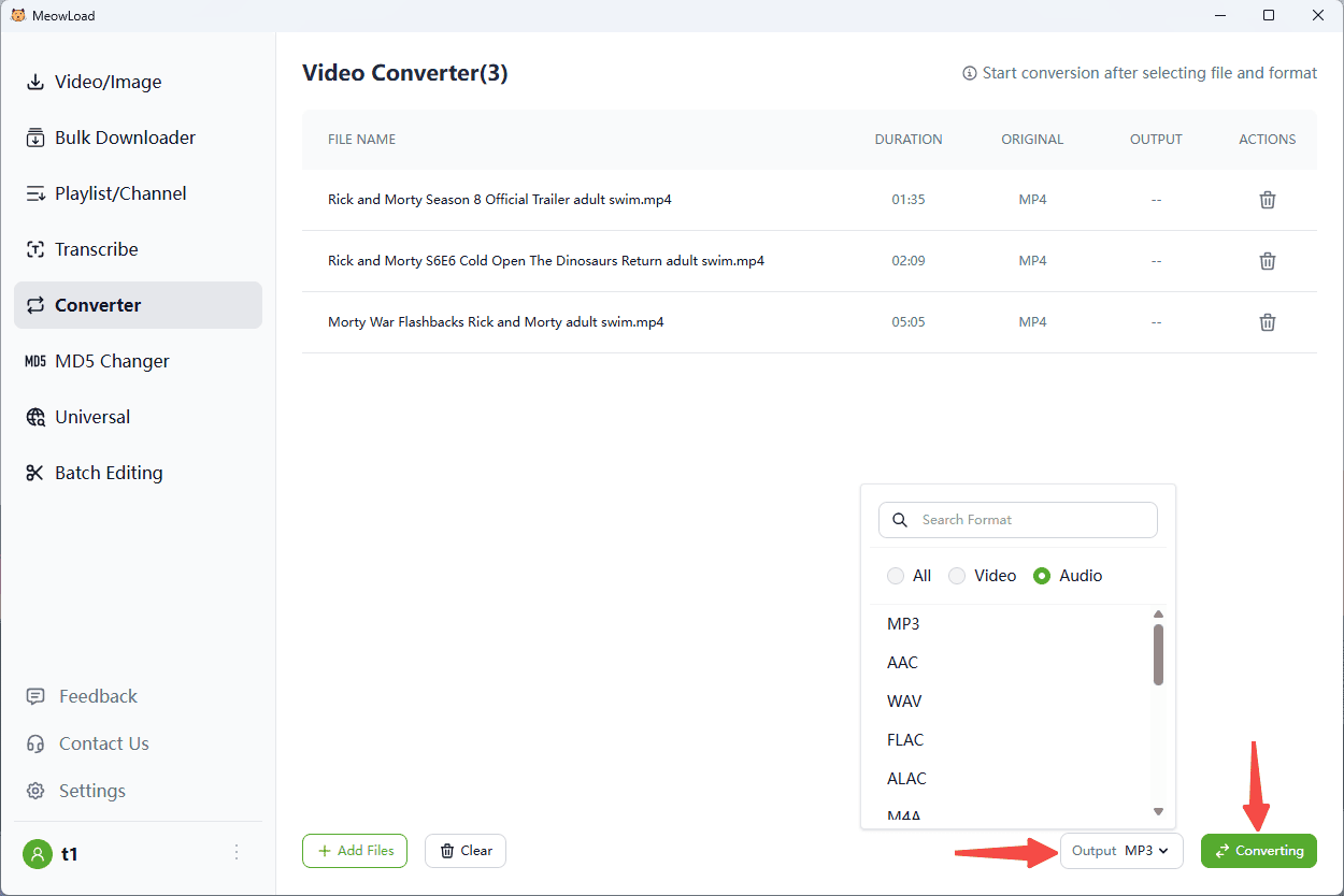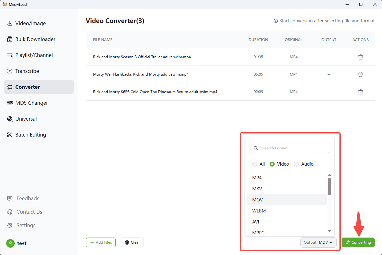 Elige el formato de destino (por ejemplo, MP4, MP3, MOV) en el menú desplegable.